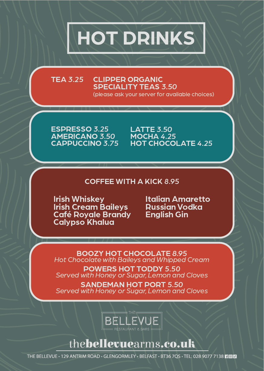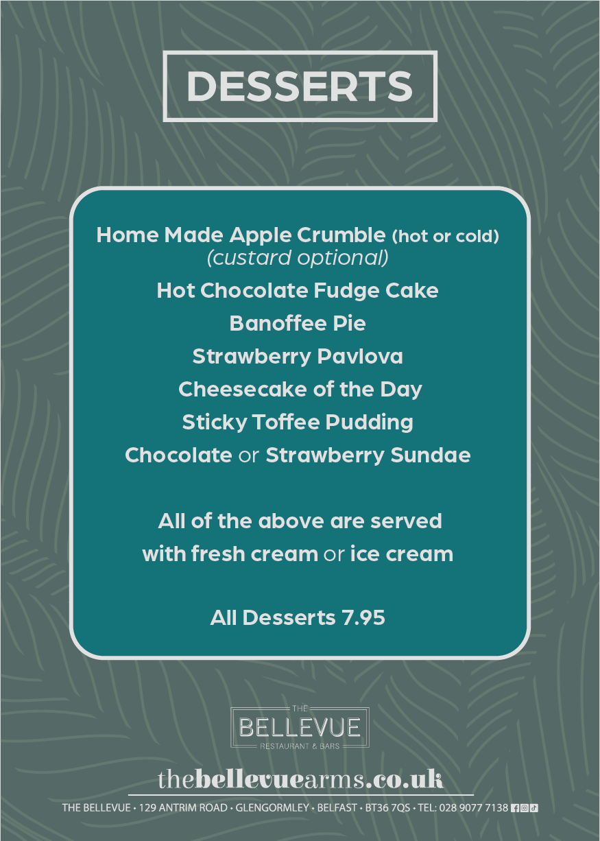 The Bellevue Arms is situated on the outskirts of Belfast, in the heart of Newtownabbey. This iconic venue boasts panoramic views of Belfast Lough from its first-floor restaurant. Comprising of Restaurant, traditional Public Bar and Lounge Bar everyone is catered for. Boasting some of the finest traditional and seasonal fayre and fabulous cocktails, our professional team will make your visit enjoyable and memorable.